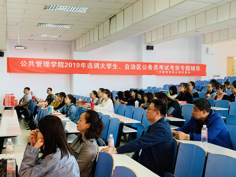 4月16日,公共管理学院和华图教育合作举办的2019年选调大学生、自治区公务员考试考前集训在行知楼406举办。集训由公共管理学院院长拓俊杰主持,我院党总支副书记、公共事业管理系主任以及2015级学生聆听了本次专题辅导。