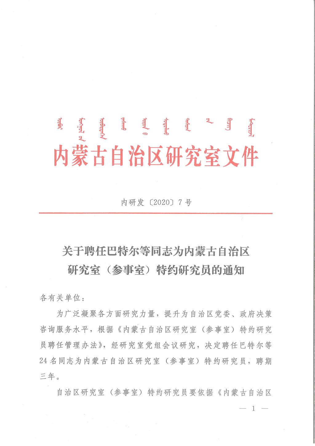 我院拓俊杰(院长、副教授、研究生导师)被内蒙古自治区研究室和自治区机构编制委员会分别聘任为特约研究员、首批特聘专家。
