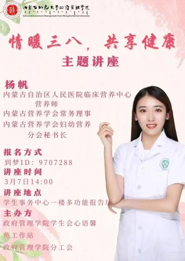 阳春三月,万物苏醒,万象更新!为了唤起对妇女权益的关注和重视,同时也为了弘扬妇女的优秀品质和价值观,政府管理学院于3月7日在学生事务中心举办了“情暖三八 共享健康”妇女节主题讲座。本次活动由政府管理学院学生会心语馨苑工作站举办。