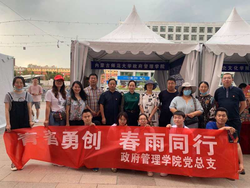 719日,政府管理学院党总支在呼和浩特市万达广场---促进内蒙古大学生和妇女就业草原集市暨“布丝瑰”民族服饰大赛作品直播电商节活动现场开展了“青春勇创 春雨同行”主题党日活动。院党总支书记樊荣忠、党总支副书记乌日古木拉、副院长王永明和学院部分党员、教职工、学生代表参加活动。